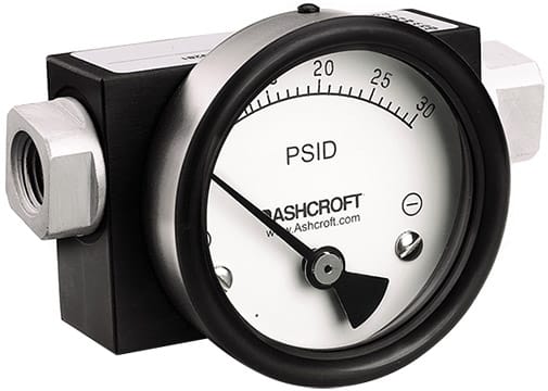 Designed for applications where process media migration is not acceptable, the Ashcroft Type 1131 differential pressure gauge employs a rolling diaphragm actuator. This design effectively isolates the high and low-pressure ports. It can withstand static pressures up to 3,000 psi and is available in pressure ranges from 0-5 psid to 0-100 psid (or equivalent).