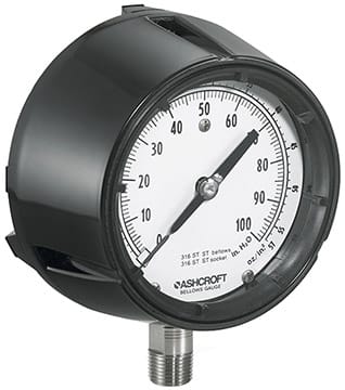 The Ashcroft 1180 series analog pressure gauges are designed with a bellows sensing element, making them perfect for low-pressure applications, including vacuum and compound ranges, typically below 10 psi. These gauges combine high sensitivity with a robust construction, suitable for both process and industrial environments.