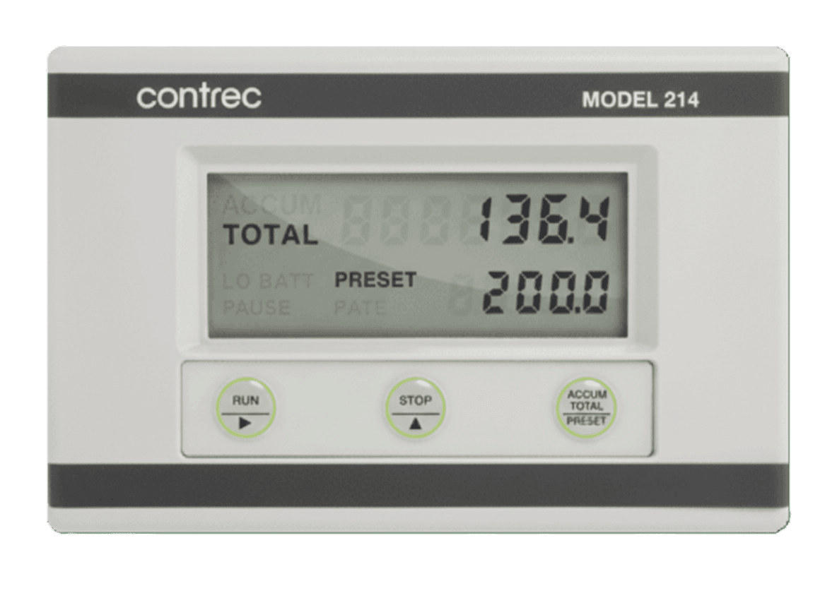 The Contrec 214D ATEX Batch Controller is ideal for low flow applications that need accurate control of batch quantities. It features a large LCD display that shows Batch Total, Accumulated Total, and Preset values clearly.
