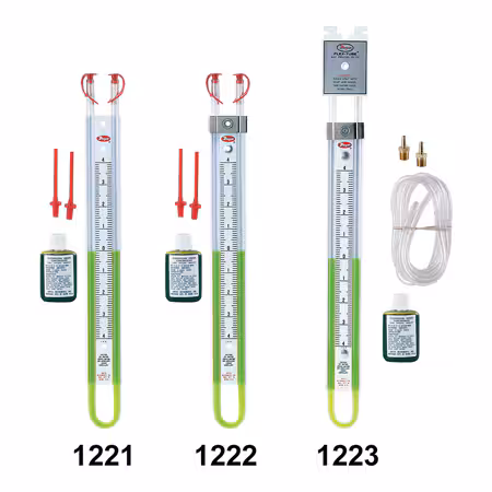 Dwyer Series 1221/1222/1223 is inexpensive manometers measure positive, negative, and differential pressures. Dwyer Flex-Tube® U-Tube Manometers combine the inherent accuracy of the simple “U” Tube with the durability of tough, long-lasting plastic construction. Columns are of .375″ O.D. flexible and shatterproof clear butyrate tubing. They are easily accessible for cleaning. The indicating tube is backed by a white scale channel to provide maximum color contrast. Scales are extruded high-impact polystyrene plastic, formed to hold columns in perfect alignment. Stark white scales have graduations and numbers silkscreen-printed in black for maximum legibility.