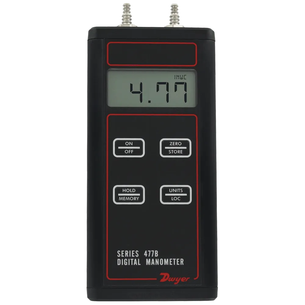 The Dwyer Series 477B Handheld Digital Manometers are versatile, hand-held, battery operated manometers available in several basic ranges from 0-20 in w.c. up to 100 psi. All models measure either positive, negative or differential pressures with ±0.10% of full scale accuracy. You can select from up to seven common English and metric pressure units so conversions are not necessary. A memory function allows storage of up to 40 readings for later recall and a backlight provides auxiliary lighting for hard-to-see locations. Also standard are a hold feature plus both visual and audible overpressure alarms.