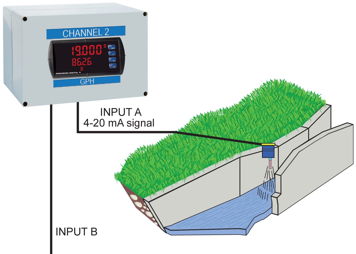 Weir Flow Calculated Using Exponential Signal Input Conditioning | Open Channel Flow (PD6262)The PD6262, in combination with ultrasonic level transmitters, makes for an economical way to measure and display open channel flow rates and totals in most weirs and flumes, and take periodic samples. All the user needs to do is enter the exponents for the weirs or flumes into the PD6262 and the PD6262 automatically raises the input signals to those powers. Sampling can be based on the total flow or the flow rate. Each channel’s signal input conditioning is programmed independently. |
