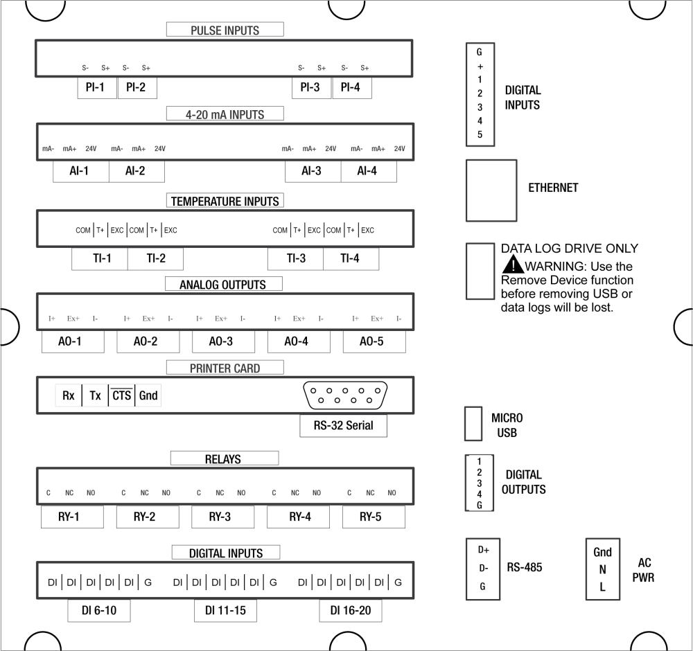 The back panel is labeled with the I/O boards that were installed at the factory. The removable connectors are labeled with the connection signal for each terminal. The following diagram shows what the back of the sku PD9000-GP-4PI-8AI-10AO-10RY looks like. This sku accepts (4) pulse and (8) analog inputs and has (10) 4-20 mA outputs and (10) relays. (5) digital inputs, (4) digital outputs, RS-485 serial capability and USB connections are standard on all ConsoliDator+ skus. Ethernet is an option.